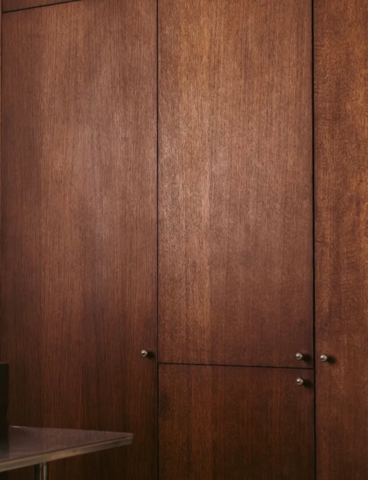 Un chantier fou, avec au cœur de nos menuiserie une seule essence : le chêne. Un chêne des Alpes françaises, naturellement clair, que nous avons teinté, huilé, poncé puis re-huilé, jusqu’à obtenir ce grain arabica qu’on aime tant.
